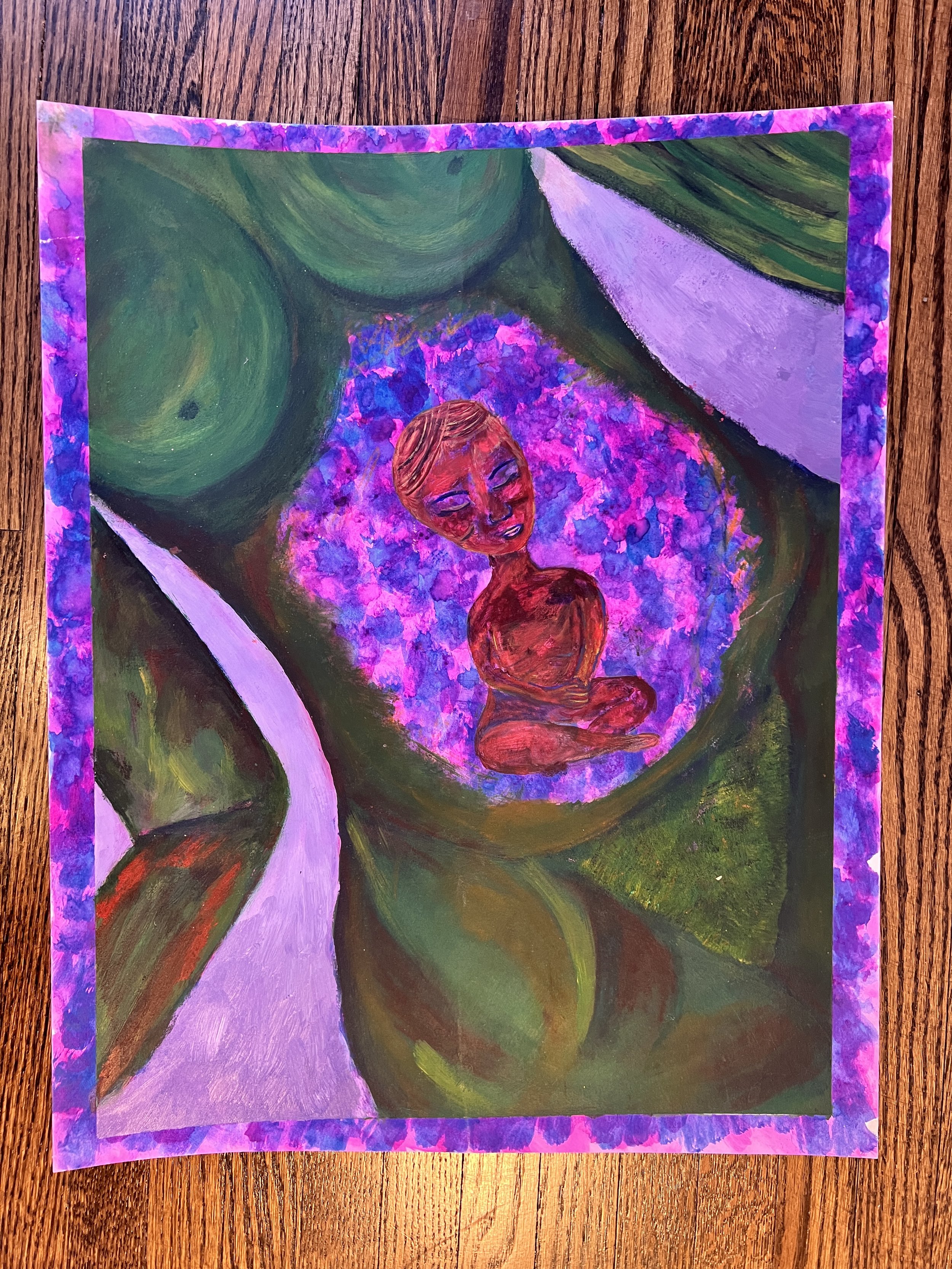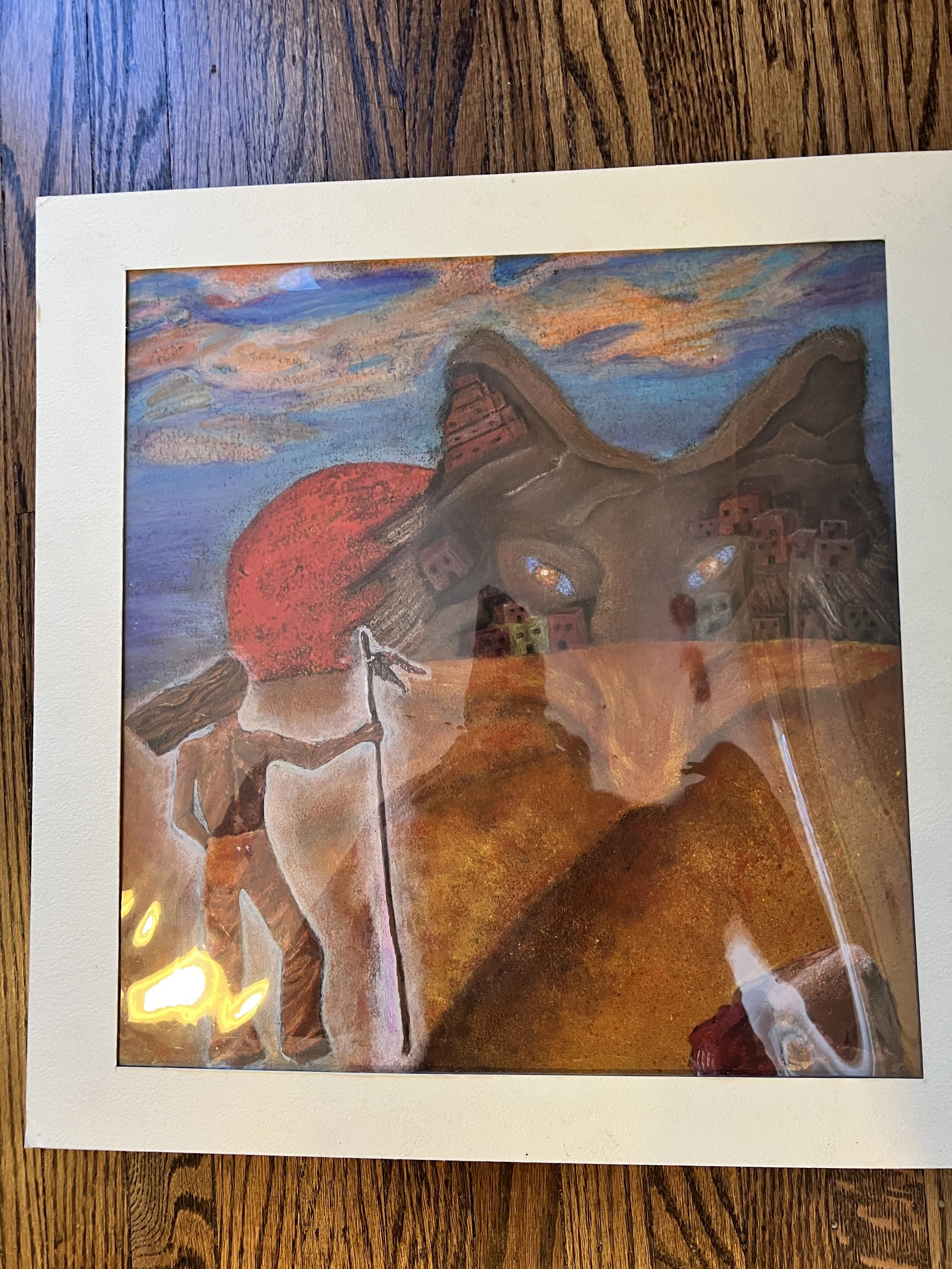 My mother’s child: In high school, my mom was at the point where she was just about to break the dysfunctional cycle she grew up in. She had kids at 16 years old, and she was a high school dropout who returned to school to get her associate’s degree (she got straight As). She moved us out of the subsides apartments and bought a home in the suburbs. She started her first job as an examiner for the county, and right when things were looking great for her, the county announced there would be layoffs. At the same time, she allowed her sister’s kid to move in with us because he was sick. Every day, she would get calls for his misbehavior, which didn’t look good to the people who were doing layoffs. No one in my family blamed him; dealing with a terminal illness was very sad. However, my mom needed to keep her job, or everything she built would crumble. Under all this stress, my mom was still able to make me feel she was always watching me. As a teenager, I would call it her evil watchful eye and tell my friends my mom knows. This painting is of my mother and I.